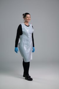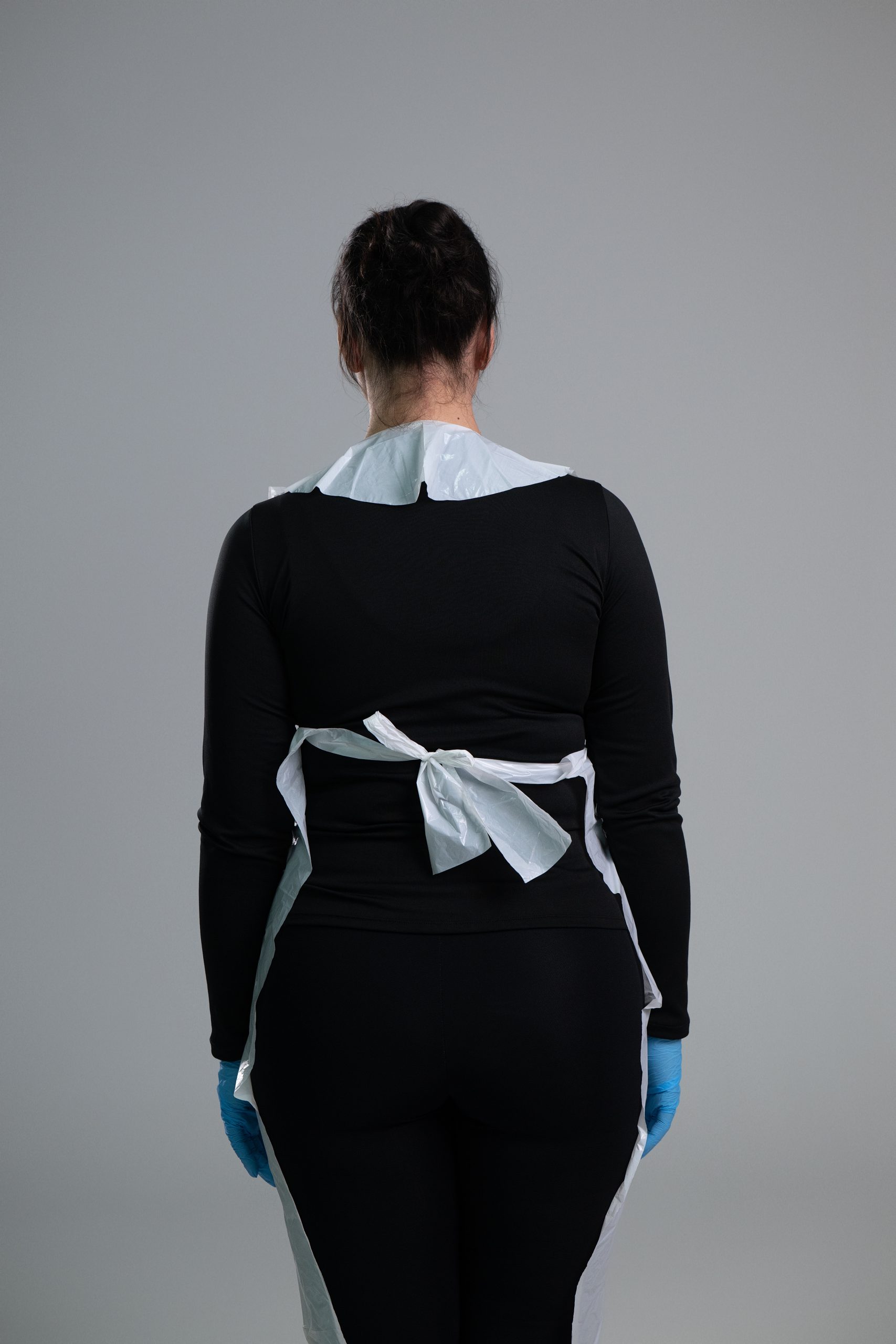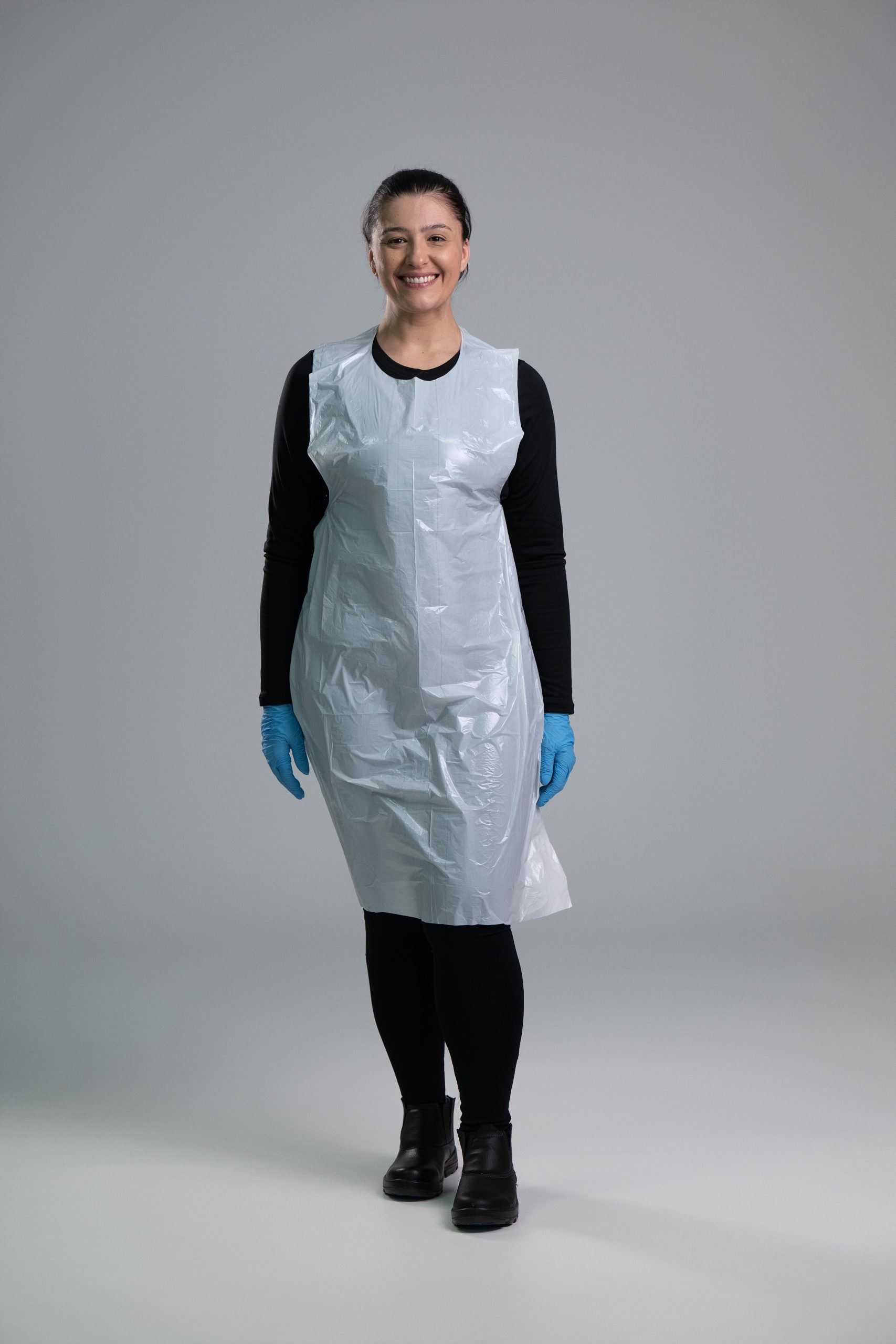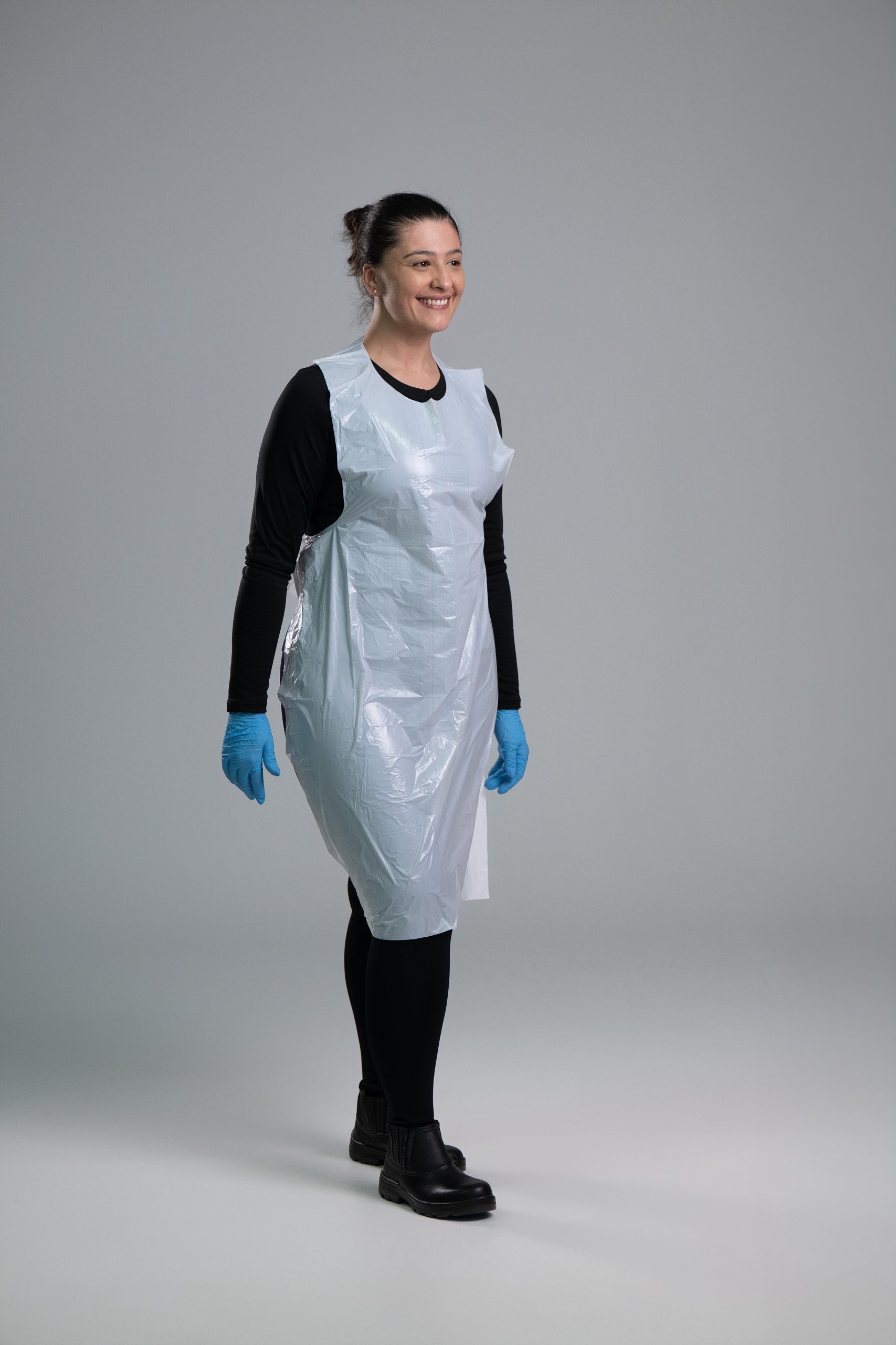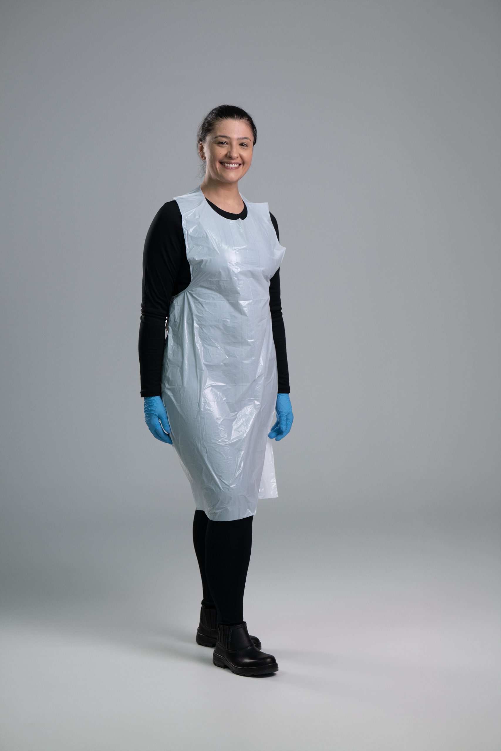 Avental de segurança impermeável, confeccionado em resina de polietileno.